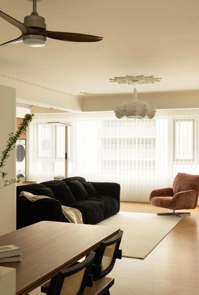 客厅以黑色绒布沙发为视觉焦点,搭配木质茶几和地毯,围合出一个舒适的会客区域。旋转椅增添了一份趣味性,同时提供了灵活的阅读或休闲功能。