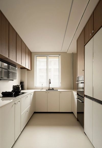 厨房采用U型布局,最大化利用空间,提供了充足的储物与操作台面。冰箱与烤箱嵌入柜体中,保持了空间的整体性。