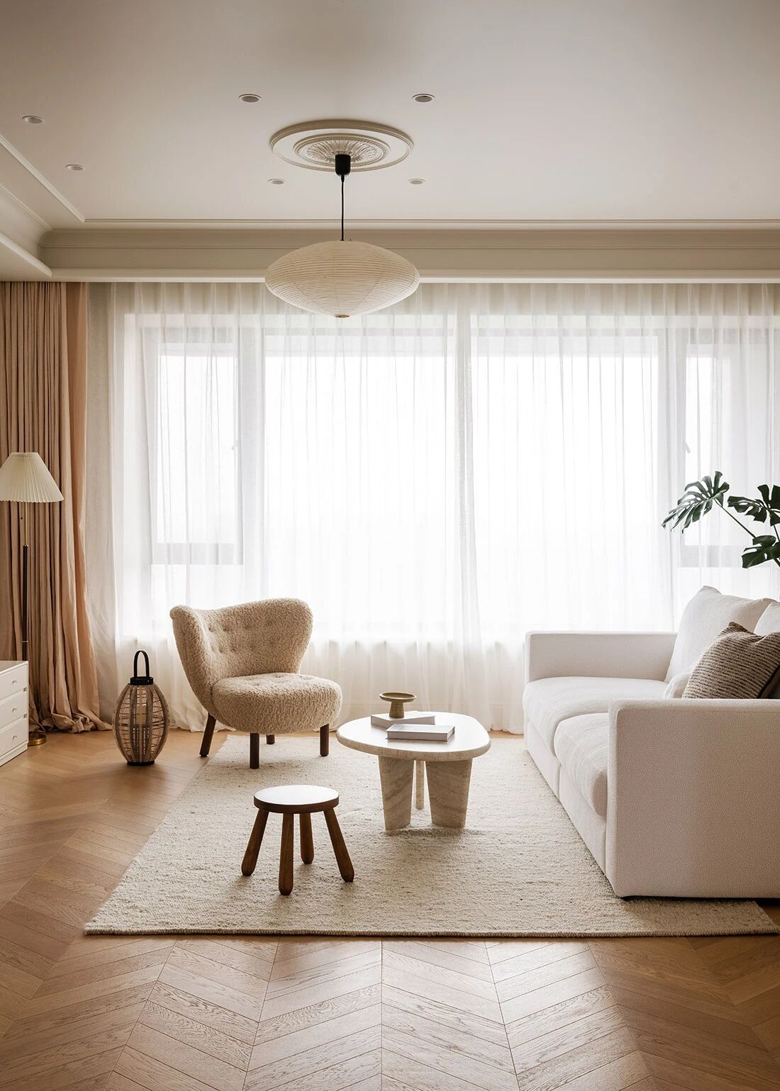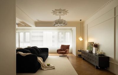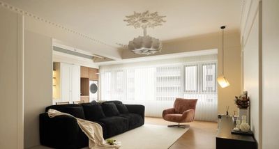 柔和的米色墙面与地板为基底,黑色沙发与暖色旋转椅形成对比,吊灯和装饰画的点缀进一步提升了空间的层次感。