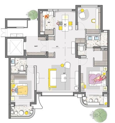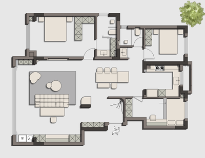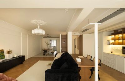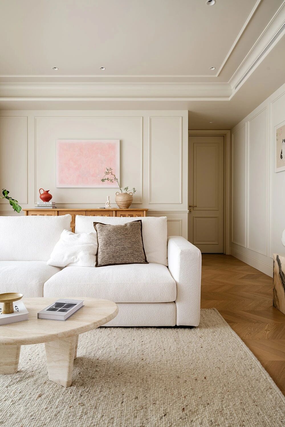 这套138平米户型的设计灵感来源于现代都市生活对舒适与实用的追求,融入了开放式空间布局、轻盈的材质、柔和的色调以及自然元素的点缀。设计师通过法式奶油风,试图打造一个既现代又温馨的居住环境。