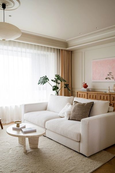 客厅地面采用暖木色鱼骨拼实木地板,以经典铺装方式奠定空间质感;墙面以奶油色乳胶漆为底,搭配精致石膏线造型,复刻法式风格的层次与优雅。家具选择浅米色布艺沙发、藤编元素木色边柜,搭配棉麻质地地毯,通过自然材质的肌理传递奶油风的柔和感;粉色艺术装饰画、复古黑陶摆件等软装点缀,为空间注入法式浪漫的细节张力。
