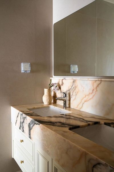 卫生间:以天然大理石为核心材质,其暖调纹理与法式奶油风的柔和感高度契合;定制卫浴柜体采用奶油色系,搭配金色复古拉手与法式线条设计,在实现功能收纳的同时,精准传递法式美学。大面积镜面延伸空间视觉,与大理石台面的天然肌理形成材质对话,花瓶花艺的点缀则为卫浴空间注入生活诗意。