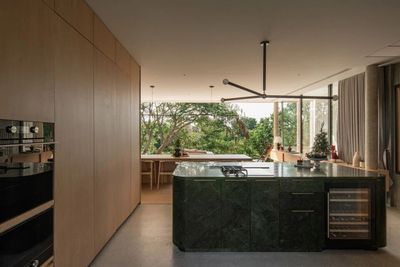 住宅二期整体使用清水混凝土,从室外自然延伸至室内墙面,形成统一的空间质感。整体氛围以温暖色调为主,木材选用原木色枫木,纹理自然清晰,与混凝土形成和谐对比。厨房区域则采用印度绿石,为空间增添现代感。