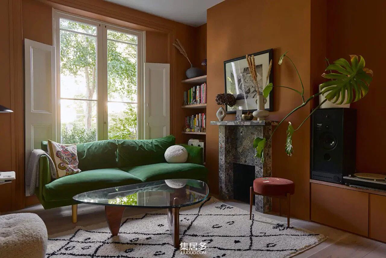 空间的巧妙布局更显设计师匠心。厨房与后院通过大面积的玻璃门相连,烹饪时抬眼便是满目绿意;顶层那间以绿色为主调的卧室,仿佛将整个花园的生机都收揽其中。当夜幕降临,百叶窗过滤后的月光与壁炉的暖光交织,在赤陶墙面上投下温柔的阴影,让人不禁想起简·奥斯汀笔下那些充满生活气息的英伦家庭。