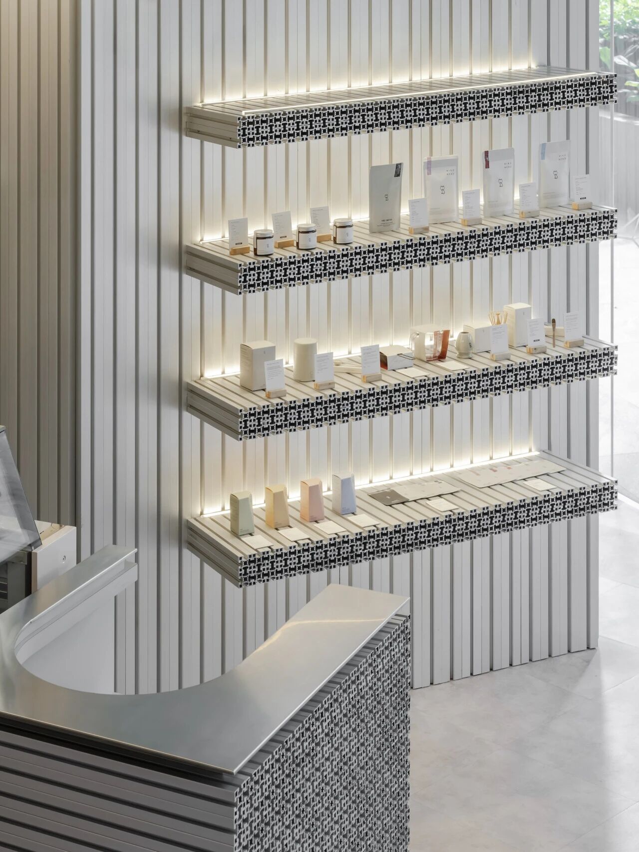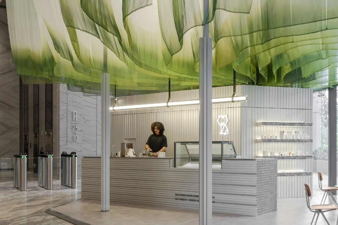 天花板上悬挂着一系列轻盈的帷幔。这些织物条由 Duniamotif 工作室手工染色,组合成一幅幅帘幕,彼此紧密相连,宛如树木横截面的年轮。上方垂落的帘幕轻轻摇曳,与定义室内墙面、吧台及展示区的铝制镶板形成鲜明对比。室内空间呈现出精致繁复的纹理,既强化了织物所营造的动态感,也进一步呼应了抹茶搅拌、调和的制作叙事。