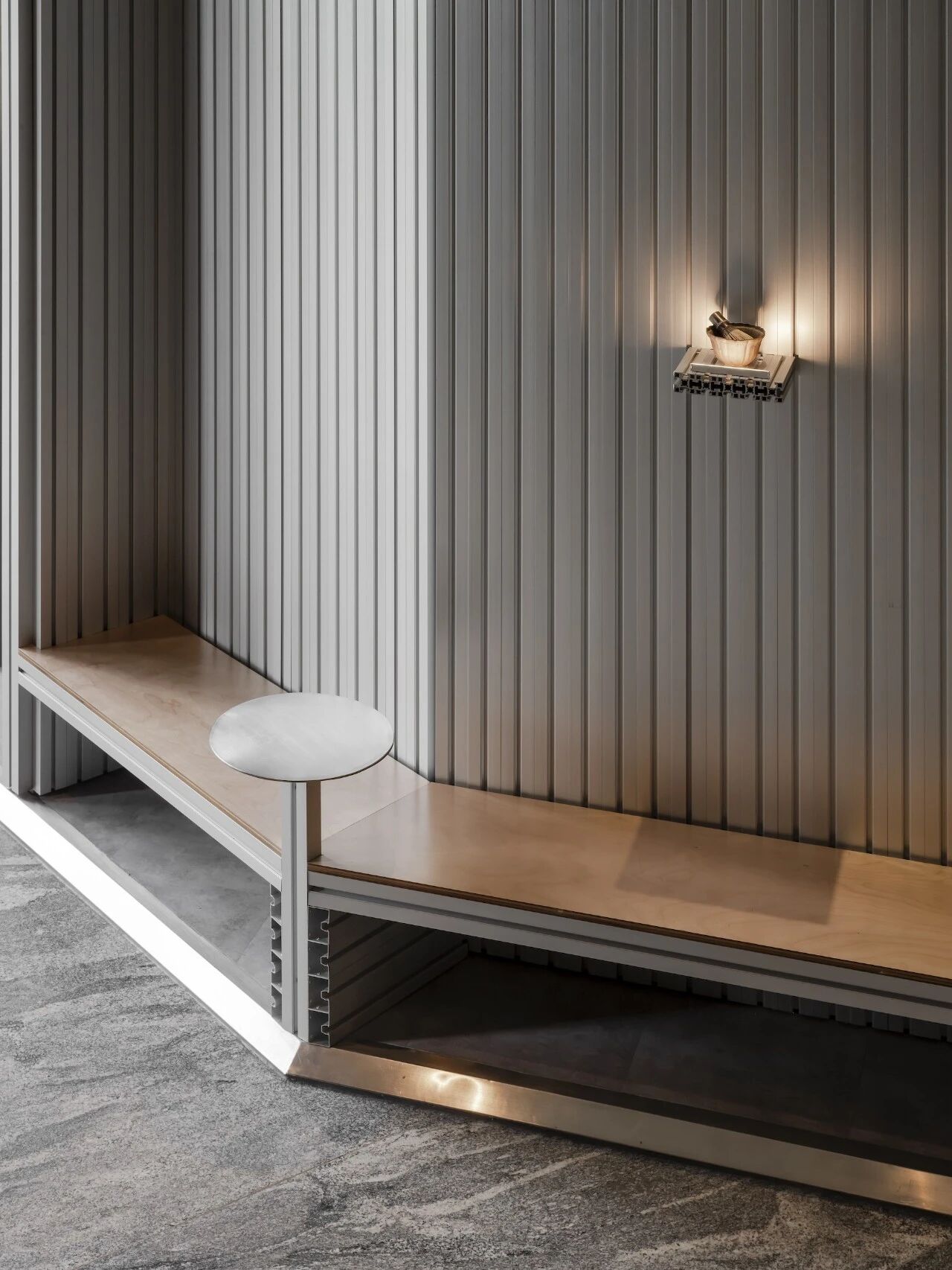 Spacemen 工作室将咖啡馆搭建在一个低矮的平台上,巧妙划分出塔楼宏伟大堂与温馨工坊之间的边界。同时,设计师借鉴了建筑大理石墙面与地面的银灰色调,确保咖啡馆与整体环境和谐统一,不显突兀。