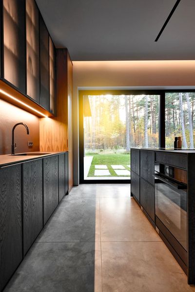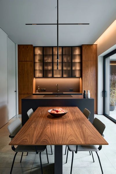 匠心独运的工艺塑造了房屋的独特气质。定制木作方案包含实心木板的集成把手、近乎隐形的通风孔,以及对黑漆白蜡木的精妙运用,巧妙融合几何造型与材质质感。精选的胡桃木凭借其独特的纹理与浓郁色泽,为地板与家具注入温暖气息,成为自然的装饰元素。