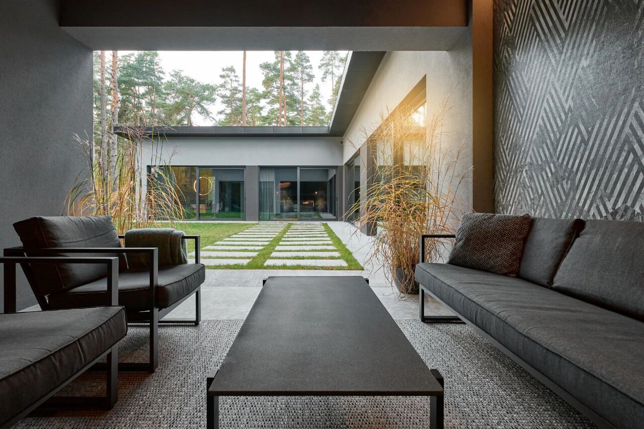 创新户外设计元素实验精神延伸至户外空间,Wall-Deco户外专用壁纸重新定义露台设计。这些壁纸专为应对多变天气而设计,经水洗即可轻松清洁,始终保持洁净如新。带顶棚的露台是家居空间的精心延伸,采用考顿钢饰面的壁炉与烧烤架,将耐用性与美学完美融合。