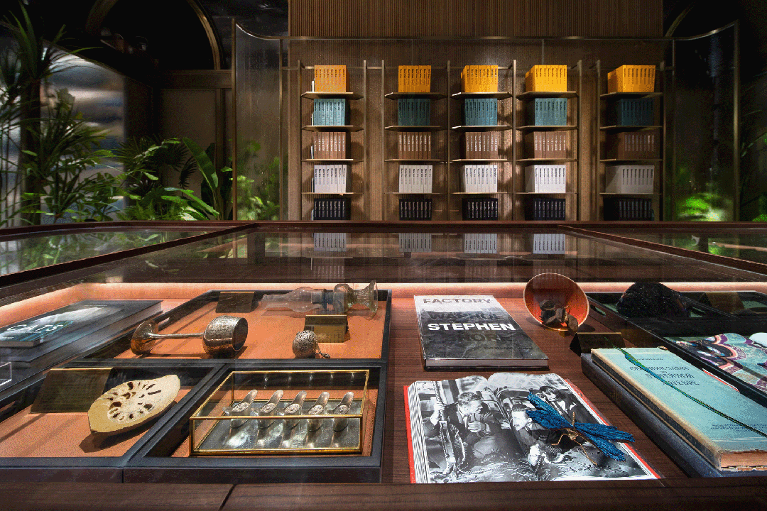 苔藓、木质、多样植物环绕成一座中央热带生态区,花艺师耗时36小时沉醉创作,于2米直径内打造一个微缩雨林。而湿地博物馆区则以金属架固定植物器皿,理性与浪漫在此悄然对话。镜面天花折射无限纵深,空间瞬间跃升为超现实艺术现场。