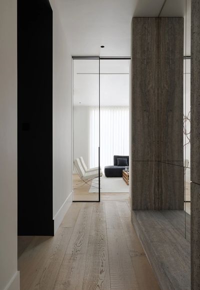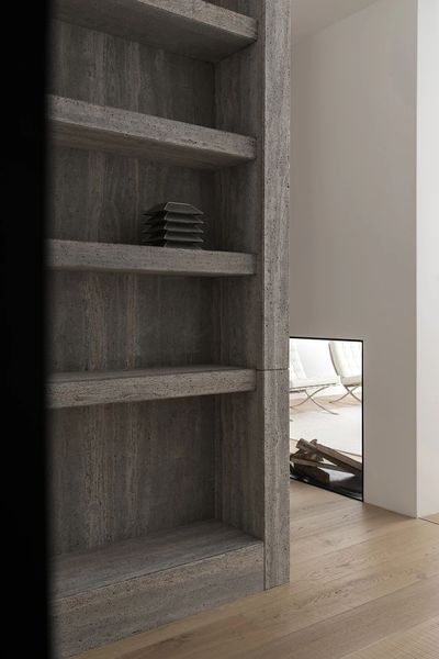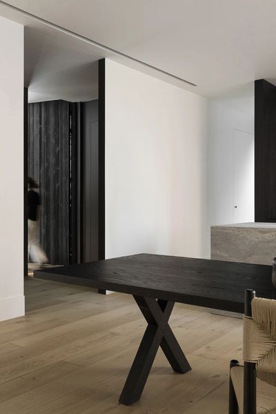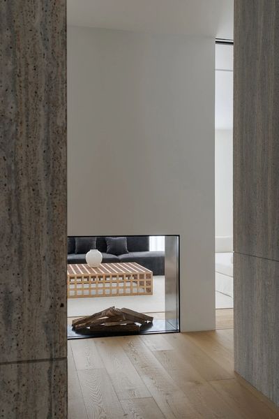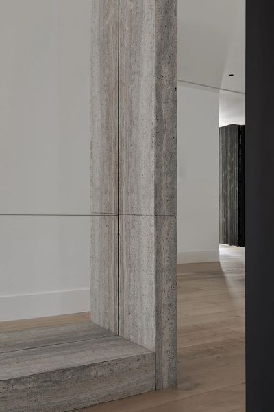 纵观整体布局,西侧餐厅区与东侧客厅区是重要的开放场域,核心功能的定位决定了面积的配比和尺度大小的控制。处于二者之间的过道,通过体块般的灰色洞石、天然木材来暗示场域的不同。材料的深浅对比,行进过程的宽窄节奏,收放自如的比例关系,不仅丰富空间视觉,也激发访客的探索欲。