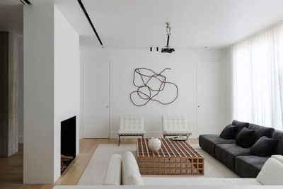 任何时候,我们都希望有一种秩序,可以使每件东西在其所位,同时我们也希望每件东西都能合其本性。为了最大化保证客厅的开间,西侧一根立柱被释放出来,同办公桌结合,一纵一横,与茶几、与白色沙发、与背景展示柜体相协调,不同高度的前后叠加,形成多层次的结构语言。