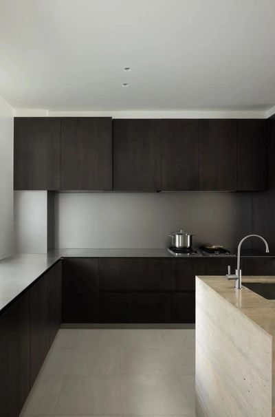 通透、明净的空间秩序中,洞石的肌理与质感为空间注入手作的温度,不锈钢的工业理性感随视觉延伸,构成冷静而清晰的功能分区。