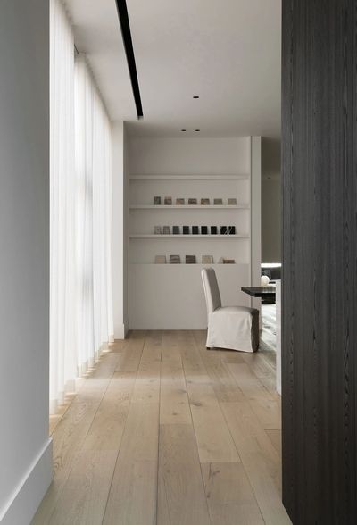 项目是河南郑州一家施工团队的工作室,有别于常规产品服务展示的方式,我们以人的体验感受为设计切入,拉近与客户的距离,展开一场平面布局的新叙事。穿过门厅,转折进入内部,视野陡然开阔,颜色由深变浅,情绪的起伏,塑造了空间感知体验的层次。调整餐厅区北侧外窗尺寸,意在形成内外的联系,光照射纱幔,均匀晕染。