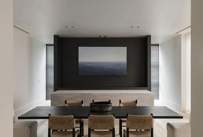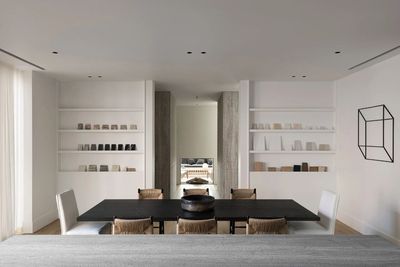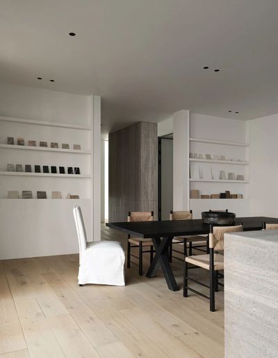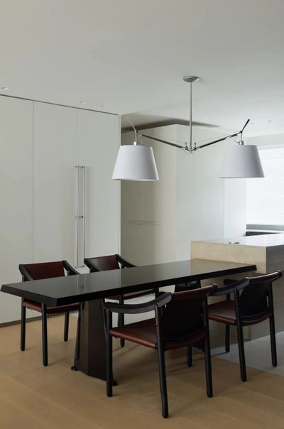 与厨房的界域消融于无形,形成一个完全开放、自由流动的整体格局。长餐桌紧密衔接岛台,构成长轴线的延展,功能与视觉在此交汇。