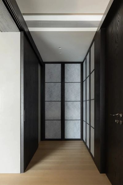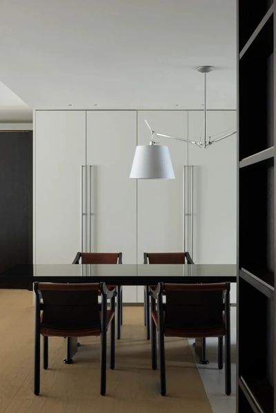 视线从主卧的静谧私域出发,可以毫无阻滞地穿过公区的闲适场景再落脚于次卧入口。这一道无形的空间轴线强化了平面的秩序感,将看似独立的功能区域紧密串联,塑造出强烈的纵深感与延伸感。