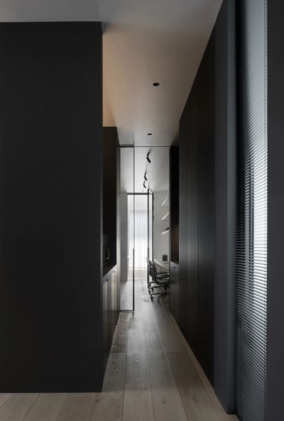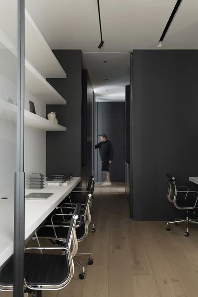 中央过道区两段灰色石墙自有目的,坚硬的立面约束出看似“唯一”的途径,肉眼不可见的东西轴线在此穿过,一侧朝向内部办公区的开口,避免同过道、公卫产生对视;一侧朝向卫生间,石材框架的底部设一面镜子,反射光,反射空间景象,反射视线,于无意间构筑了一种无限的错觉。