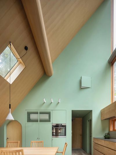 在厨房中,一扇高处的小窗隐藏在山毛榉制成的百叶窗后。这扇窗户让楼上的女儿能够从她的房间俯瞰生活区的景色。