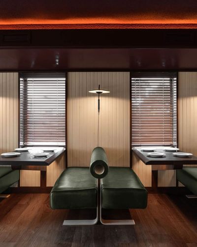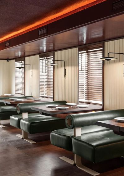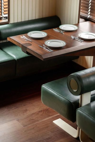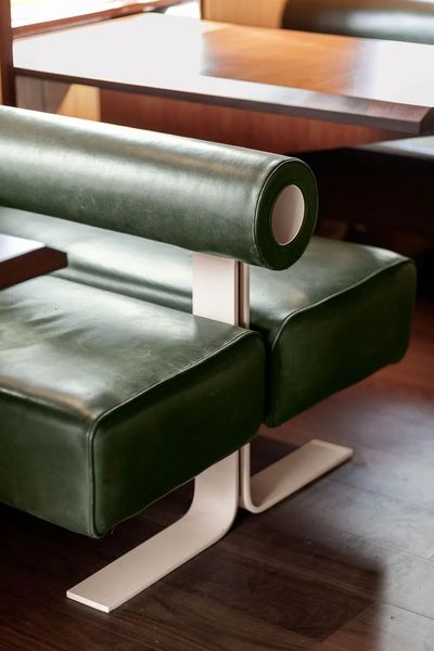New windows cut into the side façade flood the space with natural light, aligning with walnut cantilevered tables nested in niches. Paired with green leather banquettes—echoing Joe Colombo’s iconic Tube Chair—and folded steel feet, the setup balances warmth and edge. The materials—walnut’s richness, leather’s softness, steel’s crispness—create a sensory symphony, making every meal feel both comfortable and thoughtfully curated.