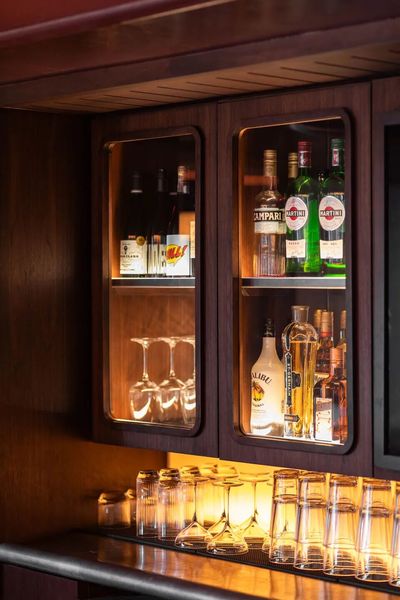 To solve low ceiling issues, mechanical systems cluster at the perimeter, raising the central ceiling into a rounded rectangle. Cove lighting here highlights the popcorn ceiling’s texture, contrasting with the high-gloss lower bulkhead—adding depth to the space. It’s a clever workaround that turns a constraint into a design highlight. The result is a room where spatial dynamics feel intentional, guiding guests’ eyes and emotions without feeling forced.