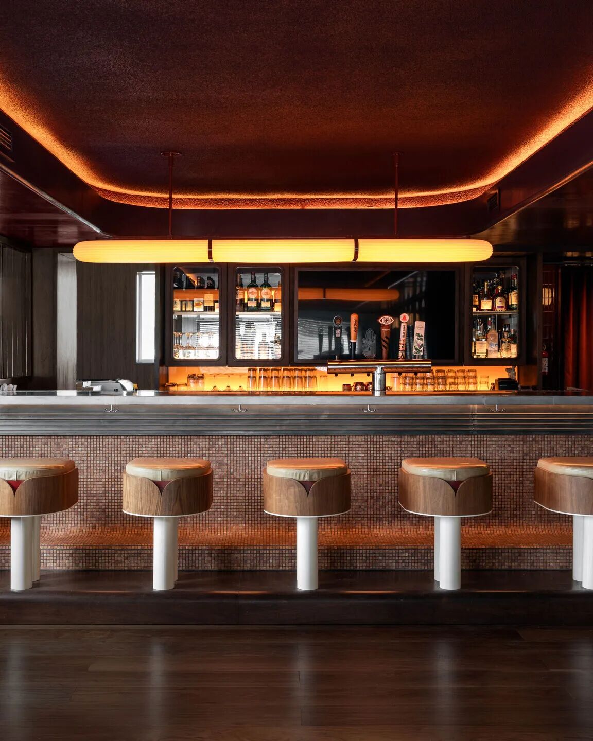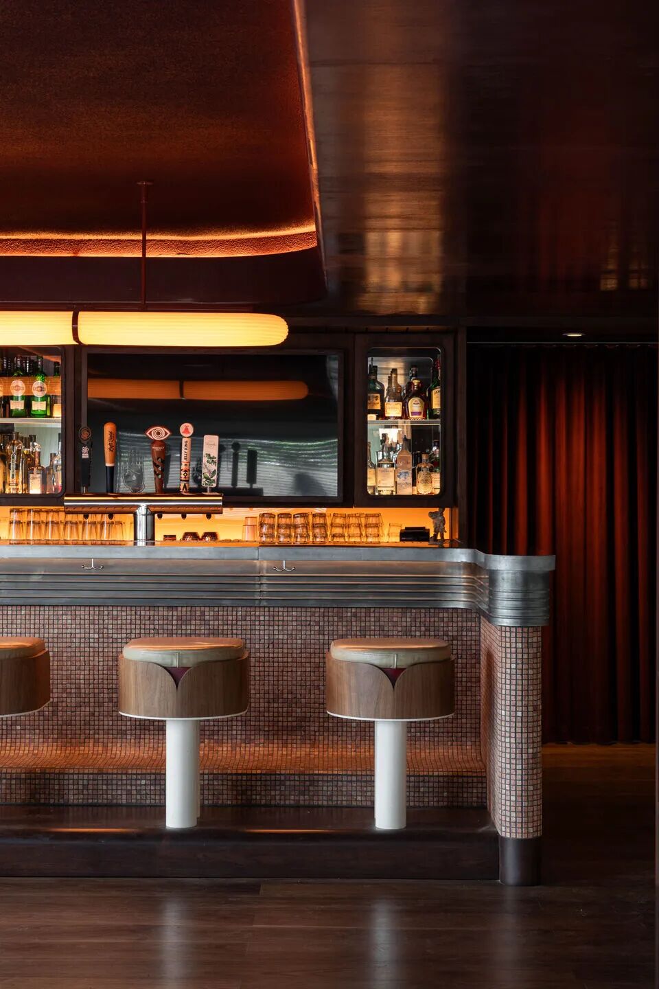 二层的 “Low Rise” 酒吧兼餐厅,以现代视角重新诠释了怀旧的意大利设计风格。这个可容纳 40 人的空间,以一座气派的吧台为核心,吧台表面覆盖着磨砂大理石马赛克,锌金属台面会随时间沉淀出独特包浆 —— 每一道痕迹、每一次光泽变化,都记录着相聚的故事。吧台上方,一盏 “In Common With” 凹槽吊灯散发着温暖光线,为空间笼罩上私密氛围。设计既致敬经典意大利待客之道,又贴合当下食客对情感联结的需求。