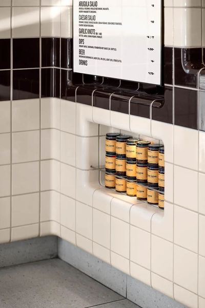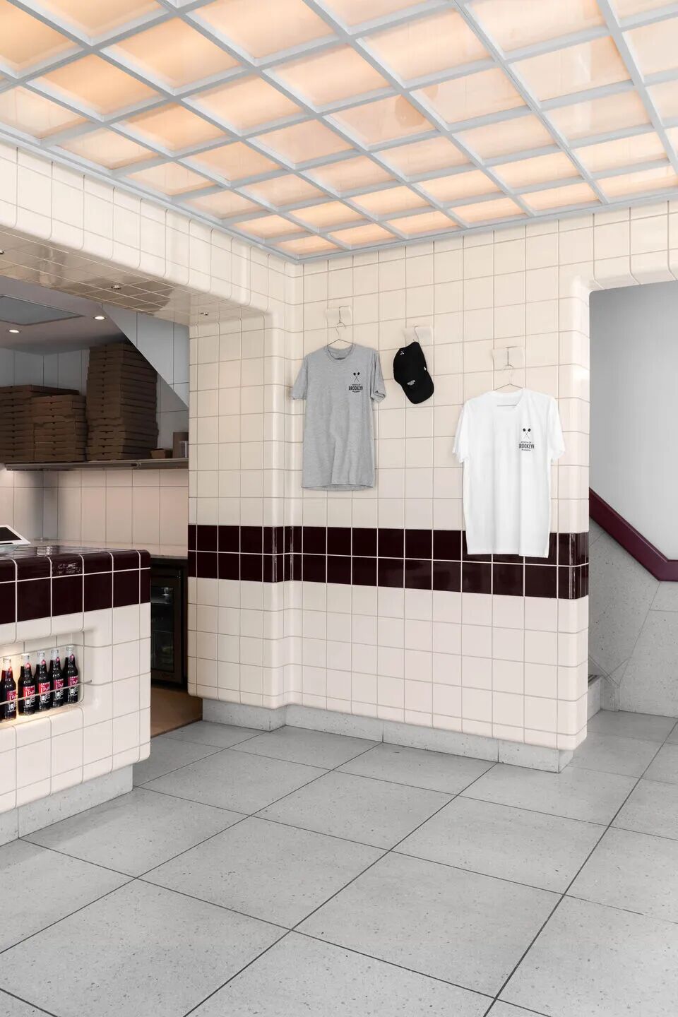 走进印有品牌标识的大型灯箱雨棚下,访客会邂逅一段极具电影感的场景,让人联想到《星球大战》的片头字幕滚动 —— 这处设计带着意外的怀旧感。室内,灯箱延伸成为外卖区的天花板,四周被 DTILE 定制模压瓷砖包裹。瓷砖从墙面一直延伸至顶面,甚至折叠成展示周边商品的挂钩,模糊了墙面装饰与实用装置的界限。这种设计将流行文化魅力与实用性结合,让外卖体验也变得格外特别。