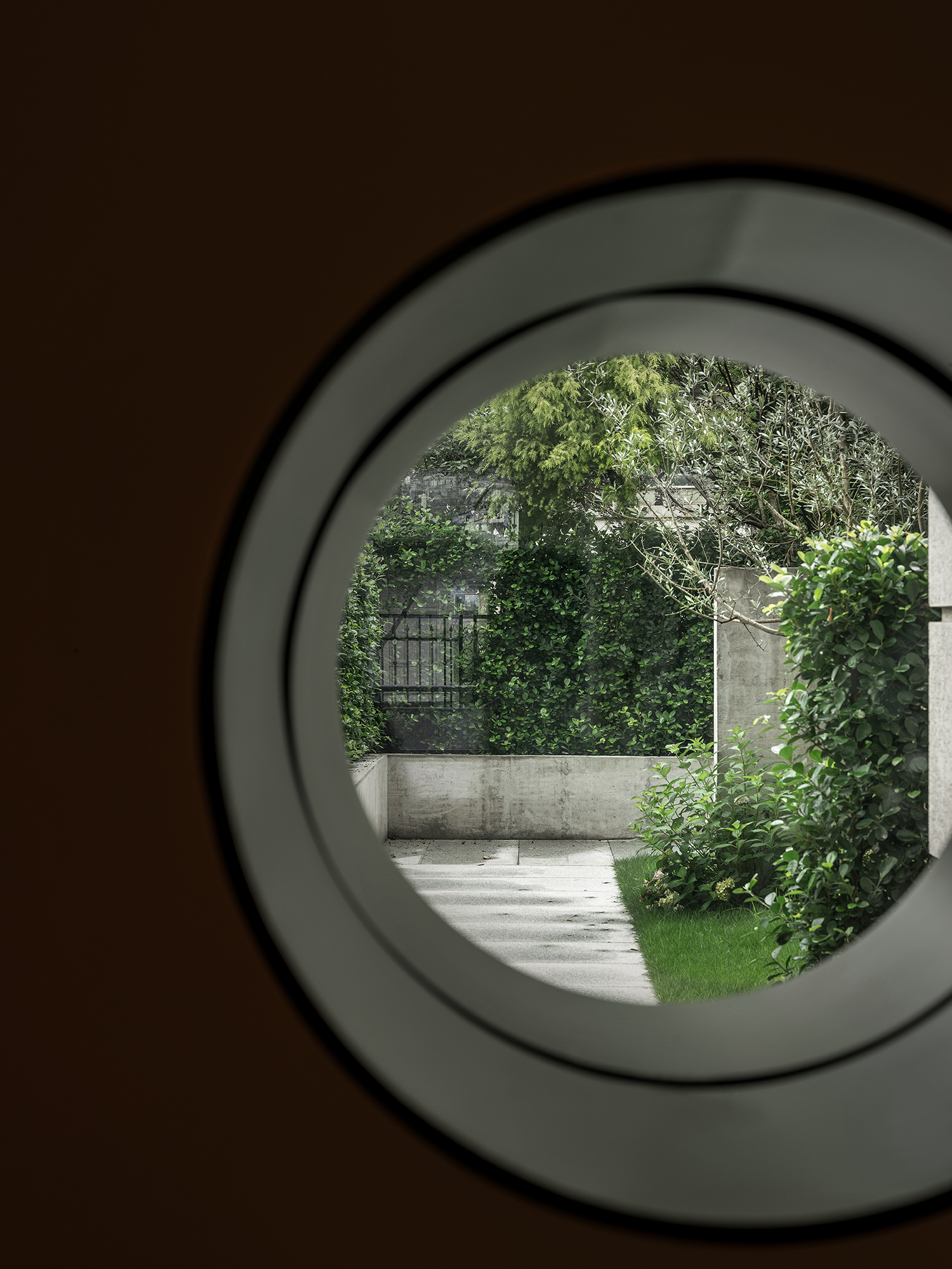 透过圆形观景窗向外望去,一条生态石径蜿蜒伸展。石径采用天然石材铺就,与自然交织在一起,呈现出时光沉淀的厚重感。