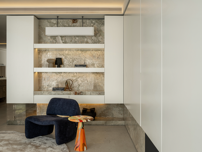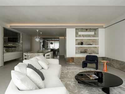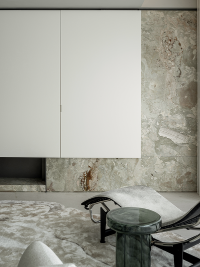 电视背景墙,采用大面积温润石材作为主基调,纹理自然流动,与一旁纯粹的白色柜门形成形成鲜明视觉碰撞,显出空间的简洁质感。