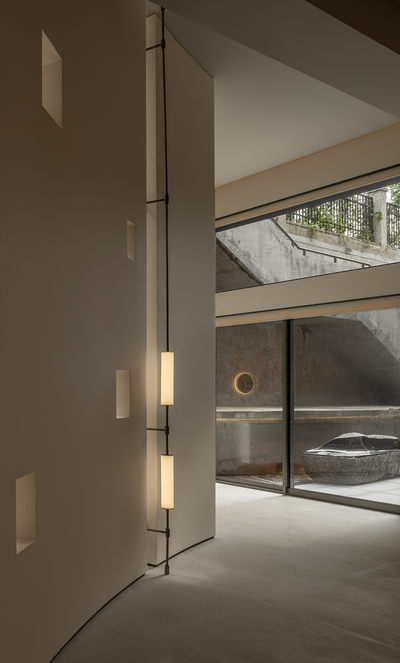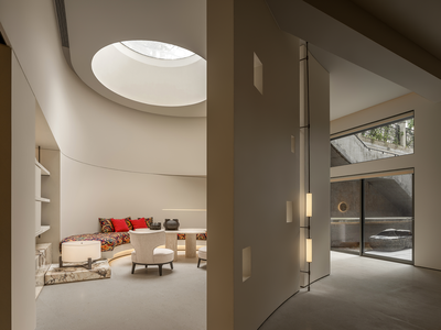 采用圆形天窗将自然光引入地下室空间,阳光如金色的丝线般倾洒而下,不同时段的光线带着各自独特的温度与色彩,为地下空间勾勒出变幻多姿的光影画卷。